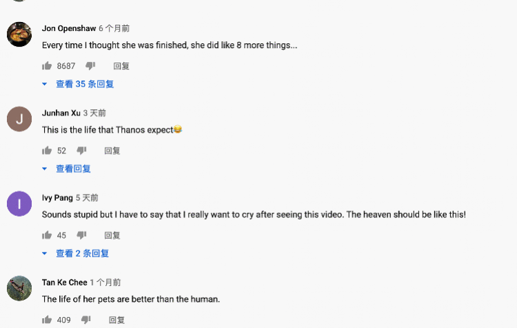 除了标题用英文介绍,李子柒的视频只有简单的中文字幕,但是这一点也不妨碍全世界网友对她的喜爱,总能收获许多真情实感的英文评论,这条视频下被赞1.3万次的名叫Kathaleen Wood的用户评价,“深深地沉浸,我知道生活原本的样子了。”
